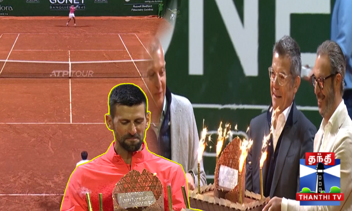 செர்பியாவை சேர்ந்த உலகப்புகழ்பெற்ற டென்னிஸ் வீரர் நோவக் ஜோகோவிச், தனது 38வது பிறந்தநாளை கொண்டாடினார். சுவிட்சர்லாந்தின் ஜெனிவா நகரில் ஜெனிவா ஓபன் டென்னிஸ் போட்டிகள் நடைபெற்று வருகின்றன. இதில் அரையிறுதிக்கு ஜோகோவிச் முன்னேறிய நிலையில், அவரிடம் பிறந்தநாள் கேக் வழங்கி போட்டி அமைப்பாளர்கள் வாழ்த்து தெரிவித்தனர். அப்போது ரசிகர்களும் மகிழ்ச்சி ஆரவாரத்துடன் பிறந்தநாள் வாழ்த்துகளை தெரிவித்தனர்.