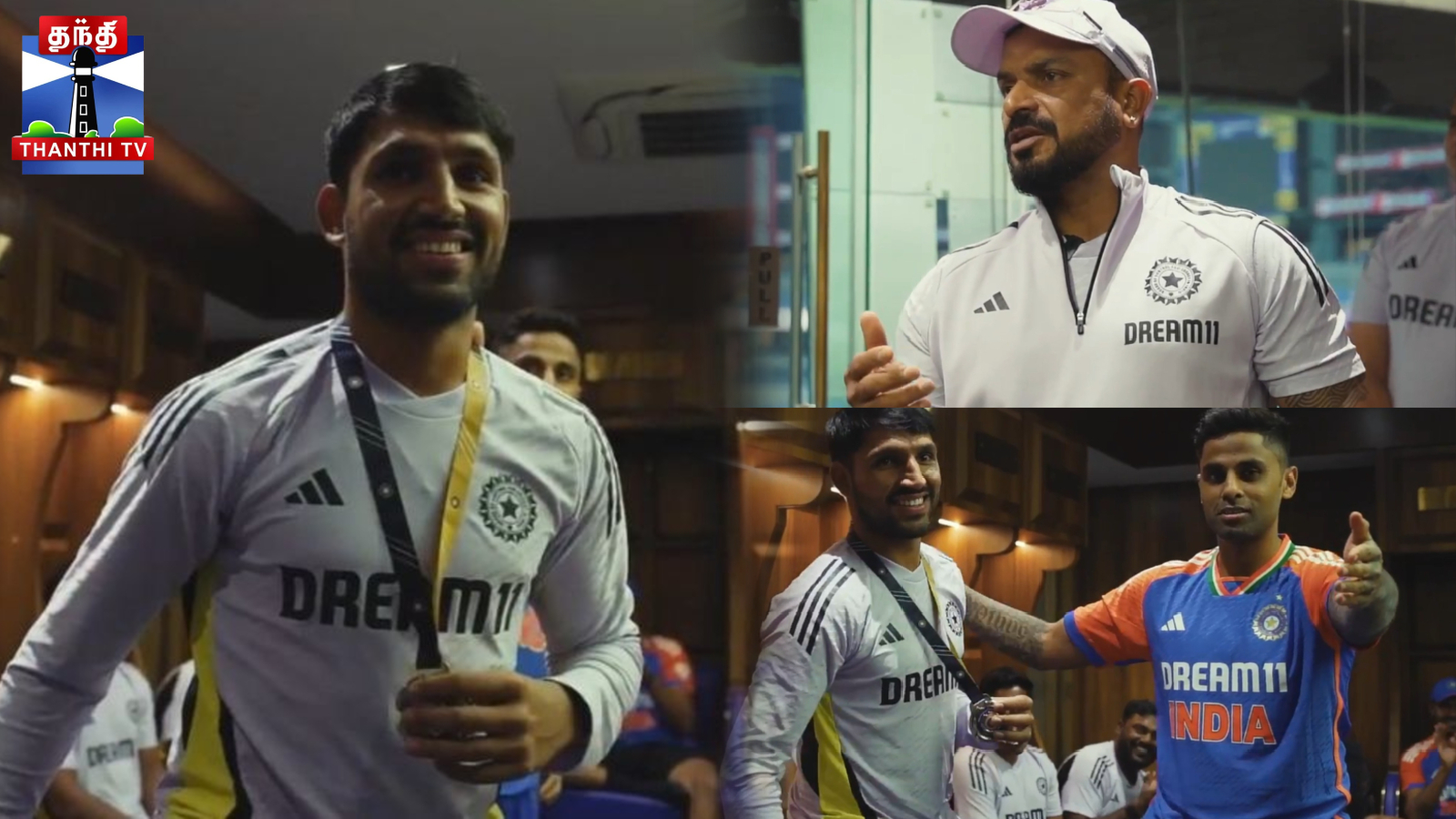 இங்கிலாந்துக்கு எதிரான டி20 தொடரை 4க்கு 1 என்ற கணக்கில் இந்தியா கைப்பற்றிய நிலையில், இந்திய அணியின் சிறந்த ஃபீல்டர் fileder விருதை துருவ் ஜுரெல் dhuruv jurel வென்றார். மும்பையில் நடைபெற்ற கடைசி டி20 போட்டியில் சப்ஸ்டியூட் substitute ஃபீல்டராக களமிறங்கி சிறப்பாக கீப்பிங் செய்த துருவ் ஜுரெல், 3 கேட்ச்சுகளைப் பிடித்தார். இந்நிலையில் துருவ் ஜுரெலுக்கு சிறந்த ஃபீல்டருக்கான பதக்கத்தை கேப்டன் சூர்யகுமார் யாதவ் அணிவித்தார். இது தொடர்பான காட்சிகளை பிசிசிஐ வெளியிட்டுள்ளது.