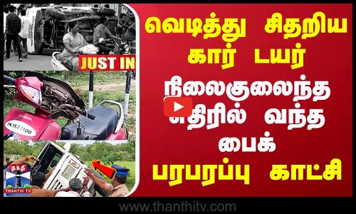 வெடித்து சிதறிய கார் டயர் நிலைகுலைந்த எதிரில் வந்த பைக் பரபரப்பு காட்சி