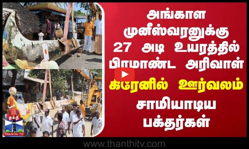 தஞ்சையில் புதிதாக கட்டப்பட்டு வரும் அங்காள முனீஸ்வரன் கோயிலில் வைக்க 27 அடி உயரமுள்ள அரிவாள் கிரேனில் வைத்து ஊர்வலமாக எடுத்துவரப்பட்ட நிலையில், வழிநெடுக பக்தர்கள் சாமியாடி வந்தனர்... கூடுதல் விவரங்களை செய்தியாளர் சையத் மௌலானாவிடம் கேட்கலாம்...