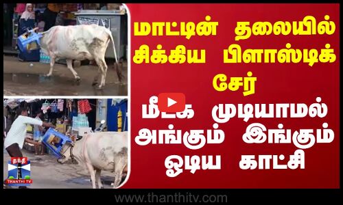 மாட்டின் தலையில் சிக்கிய பிளாஸ்டிக் சேர் மீட்க முடியாமல் அங்கும் இங்கும் ஓடிய காட்சி