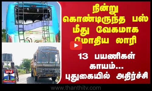 புதுக்கோட்டை மாவட்டத்தில் நின்று கொண்டிருந்த பேருந்து மீது லாரி மோதியதில் 13 பேர் காயமடைந்தனர்.