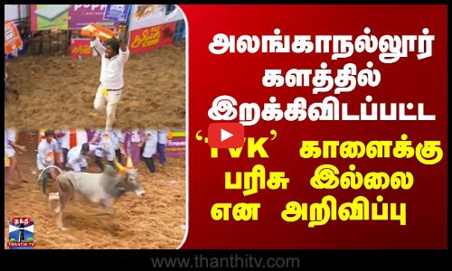 அலங்காநல்லூர் ஜல்லிக்கட்டுப் போட்டியில் களமிறக்கப்பட்ட தவெக மாவட்ட செயலாளர் விஜய்அன்பன் என்பவரது காளை வெற்றி பெற்ற நிலையில், கட்சிக் கொடியை காட்டியதால் மாட்டிற்கு பரிசு இல்லை என அறிவிக்கப்பட்டது...