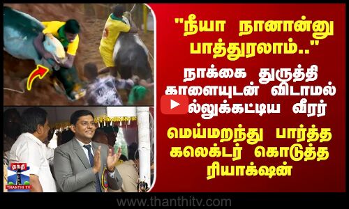 Avaniyapuram Jallikattu | "நீயா நானான்னு பாத்துரலாம்.." - காளையுடன் விடாமல் மல்லுக்கட்டிய வீரர்..