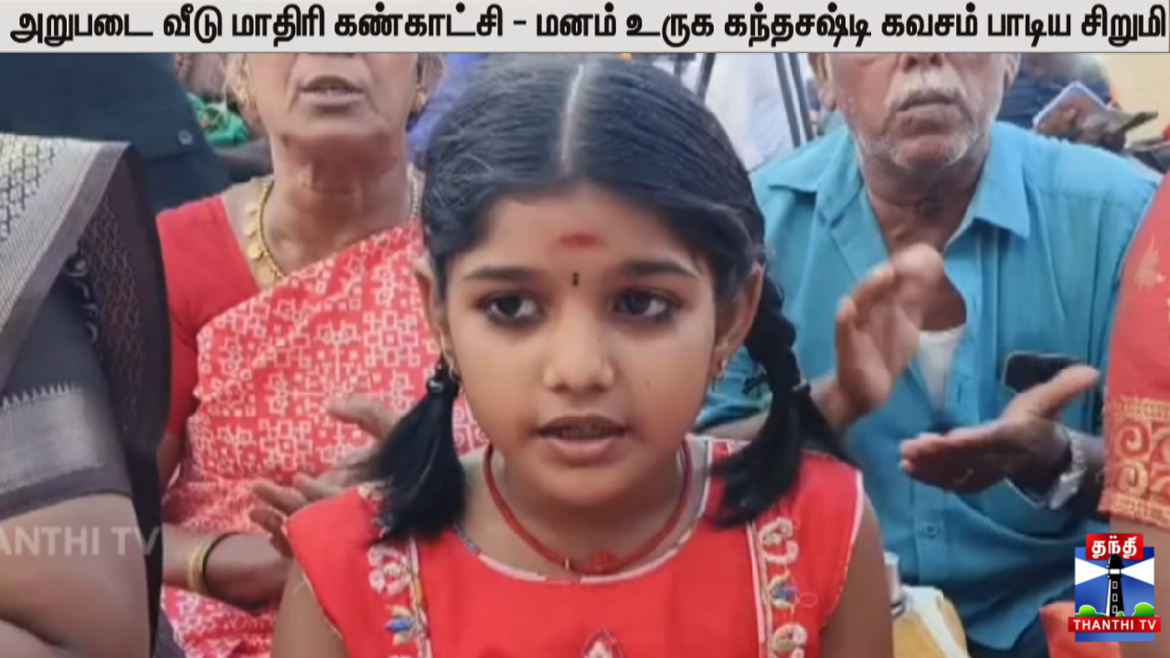 மதுரை முருக பக்தர்கள் மாநாட்டு திடலில் அமைக்கப்பட்டுள்ள, அறுபடை வீடு மாதிரி கண்காட்சியில் மனம் உருக கந்தசஷ்டி கவசம் பாடிய சிறுமியால் பக்தர்கள் மெய்சிலிர்த்தனர். அறுபடை முருகன் கோயில் மாதிரி கண்காட்சியில் நாள்தோறும் ஆயிரக்கணக்கான பக்தர்கள் சாமி தரிசனம் செய்து செல்கின்றனர். அதன்படி, தனது உறவினர்களுடன் வந்து சாமி தரிசனம் செய்த சிறுமி ஒருவர் அறுபடை வீடு மாதிரி கண்காட்சி முன்பு அமர்ந்து மனம் உருக கந்தசஷ்டி கவசம் பாடியது, அனைவரின் கவனத்தையும் ஈர்த்துள்ளது.