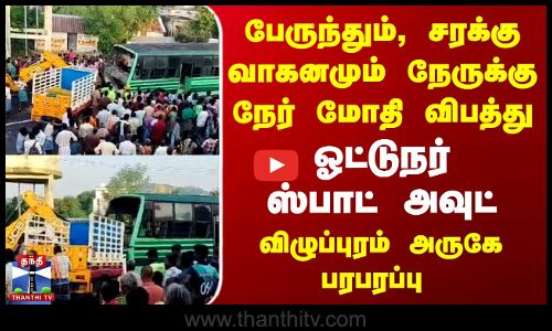 பேருந்தும், சரக்கு வாகனமும் நேருக்கு நேர் மோதி விபத்து...ஓட்டுநர் ஸ்பாட் அவுட்