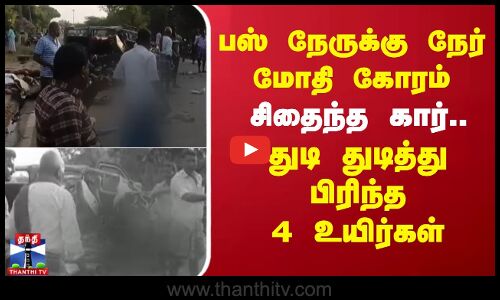 பஸ் நேருக்கு நேர் மோதி கோரம் - சிதைந்த கார்.. துடி துடித்து பிரிந்த 4 உயிர்கள்