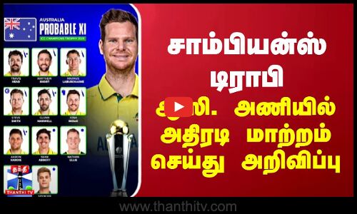 ஐசிசி சாம்பியன்ஸ் ட்ராபி தொடருக்கான புதுப்பிக்கப்பட்ட ஆஸ்திரேலிய அணியை, அந்நாட்டு கிரிக்கெட் வாரியம் அறிவித்துள்ளது. Pat cummins விலகிய நிலையில், அணியின் கேப்டனாக Steve Smith நியமிக்கப்பட்டுள்ளார். டிராவிஸ் ஹெட், மேக்ஸ்வெல், ஆடம் ஜாம்பா, சீன் அபாட், அலெக்ஸ் கேரி, நேதன் எல்லீஸ், ஜோஷ் இங்கிலீஸ் ஆகியோர் அணியில் இடம்பெற்றுள்ளனர். பல முக்கிய வீரர்கள் விலகியதால் டுவார்ஷூஸ், ஜேக் ஃப்ரேசர், ஆரோன் ஹார்டி, ஸ்பென்சர் ஜான்சன், லபுஷேன், தன்வீர் சங்கா உள்ளிட்ட வீரர்கள் அணியில் சேர்க்கப்பட்டுள்ளனர்.