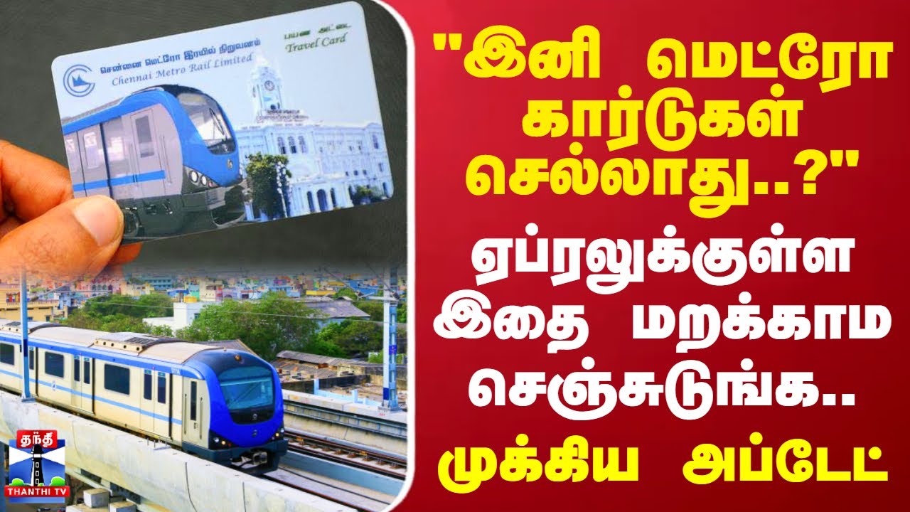 - இந்நிலையில், வரும் ஏப்ரல் முதல் மெட்ரோ கார்டுகள் செல்லுபடியாகாது என தகவல் வெளியாகியுள்ளது.