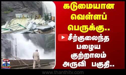 கடுமையான வெள்ளப்பெருக்கு.. சீர்குலைந்த பழைய குற்றாலம் அருவி பகுதி..