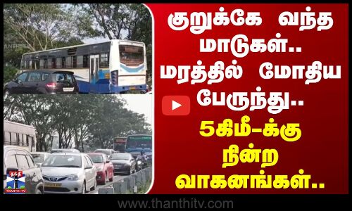 குறுக்கே வந்த மாடுகள்.. மரத்தில் மோதிய பேருந்து..5கிமீ வரை நின்ற வாகனங்க