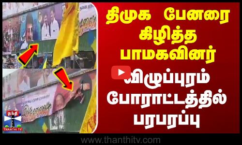 திமுக பேனரை கிழித்த பாமகவினர் - பரபரப்பு/விழுப்புரத்தில் பாமக போராட்டம் நடந்த இடத்தின் அருகே இருந்த திமுக பேனர் கிழிப்பு/பாமகவினர் திடீரென திமுக பேனரை கிழித்ததால் பெரும் பரபரப்பு