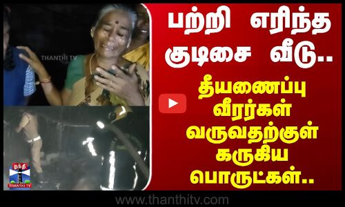 பற்றி எரிந்த குடிசை வீடு.. தீயணைப்பு வீரர்கள் வருவதற்குள் கருகிய பொருட்கள்