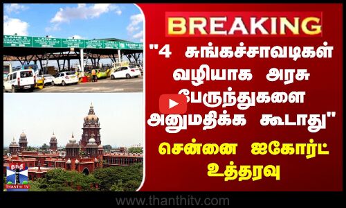 "4 சுங்கச்சாவடிகள் வழியாக அரசு பேருந்துகளை அனுமதிக்க கூடாது"/தென்மாவட்ட நெடுஞ்சாலைகளில் உள்ள 4 சுங்கச்சாவடிகள் வழியாக அரசு பேருந்துகளை அனுமதிக்க கூடாது/சென்னை உயர் நீதிமன்றம் அதிரடி உத்தரவு