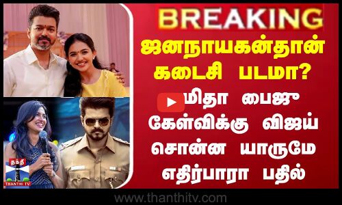 "விஜய் தொடர்ந்து நடிப்பாரா? - சூசகம்"/"2026 தேர்தல் முடிவைப் பொறுத்தே சினிமாவில் தொடர்ந்து நடிப்பது குறித்து முடிவு செய்வேன் என கூறினார் விஜய்"/ஜனநாயகன்தான் கடைசி படமா என நான் கேட்டதற்கு தேர்தலை சுட்டிக்காட்டி விஜய் பதில் - நடிகை மமிதா பைஜூ/த.வெ.க-வை தொடங்கியபோது ஜனநாயகன்தான் தனது கடைசி படம் என கூறி இருந்தார் விஜய்/விஜய் குறித்து நடிகை மமிதா பைஜூ பேசிய வீடியோ வைரல்/மலையாள திரைத்துறையில் முன்னணி நடிகையாக வலம் வரும் மமிதா பைஜூ, ஜனநாயகன் படத்தில் முக்கிய கதாபாத்திரத்தில் நடித்துள்ளார்