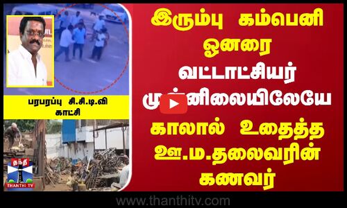 குன்றத்தூர் அருகே, இரும்பு கம்பெனி உரிமையாளரை, ஊராட்சி மன்றத் தலைவரின் கணவர் காலால் எட்டி உதைக்கும் சி.சி.டி.வி காட்சிகள் வெளியாகியுள்ளன. இரண்டாம் கட்டளை ஊராட்சி, ராகவேந்திரா நகர் பகுதியில், மதன் எனபவரது இரும்பு குடோன் தீப்பிடித்து எரிந்த சம்பவத்தில், அதுகுறித்த புகாரை விசாரிக்க வட்டாட்சியர் உள்ளிட்ட அதிகாரிகளுடன், ஊராட்சி மன்ற தலைவர் சாந்தா தேவியின் கணவர் சுகுமாரும் வந்திருந்தார். அப்போது மதன் மற்றும் சுகுமார் இடையே வாக்குவாதம் ஏற்பட்டு சுகுமார், மதனை காலால் எட்டி உதைத்துள்ளார். இதுதொடர்பாக இருதரப்பினரும் அளித்த புகாரின்பேரில் போலீசார் விசாரணை நடத்தி வருகின்றனர்.