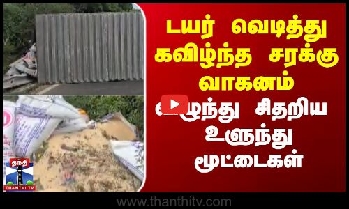 டயர் வெடித்து கவிழ்ந்த சரக்கு வாகனம் - விழுந்து சிதறிய உளுந்து மூட்டைகள்