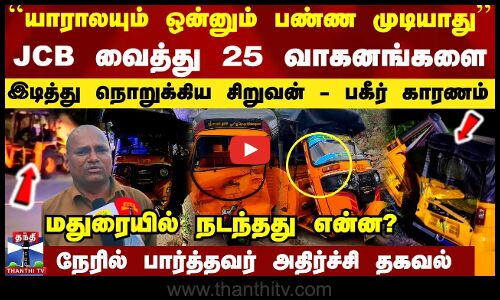 25 வாகனங்களை சேதப்படுத்திய சிறுவன் - நடந்தது என்ன?/மதுரையில் ஜேசிபி இயந்திரம் மூலம் வாகனங்களை சேதப்படுத்திய சிறுவன்/25க்கும் மேற்பட்ட வாகனங்களை கபளீகரம் செய்த சிறுவன் - பரபரப்பு சிசிடிவி காட்சி/மதுரை செல்லூர் பகுதியில் நள்ளிரவில் ஜேசிபி இயந்திரத்தை எடுத்துச் சென்று 25க்கும் மேற்பட்ட வாகனங்களை நொறுக்கியதால் பரபரப்பு/சிறுவனை பிடித்து காவல்துறையினரிடம் ஒப்படைத்த பொதுமக்கள்/போதையில் நடந்த சம்பவமா? என காவல்துறை விசாரணை/சிறுவனின் செயலால் வாழ்வாதாரத்தை இழந்து தவிப்பதாக பாதிக்கப்பட்டோர் குமுறல்