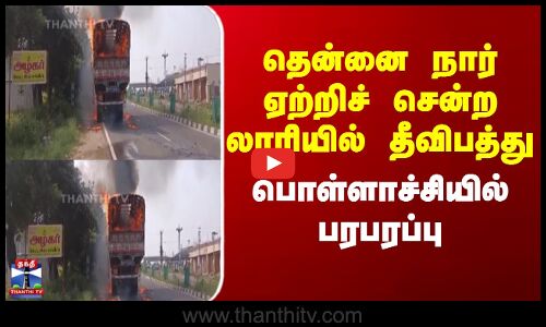 தென்னை நார் ஏற்றிச் சென்ற லாரியில் தீவிபத்து - பொள்ளாச்சியில் பரபரப்பு