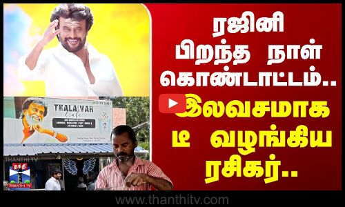 ரஜினி பிறந்த நாள் கொண்டாட்டம்.. இலவசமாக டீ வழங்கிய ரசிகர்..ரஜினியின் பிறந்த நாளை ஒட்டி இலவசமாக டீ வழங்கிய ரசிகர். நடிகர் ரஜினிகாந்தின் பிறந்த நாளை ஒட்டி புதுக்கோட்டையில் ரஜினி ரசிகர், தான் நடத்தி வரும் டீக்கடையில் மதியம் வரை அனைவருக்கும் இலவசமாக டீ வழங்கினார். ரஜினிகாந்தின் பிறந்தநாளை அவரது ரசிகர்கள் கோலாகலமாக கொண்டாடினர். இந்நிலையில் பெரியார் நகரில் டீக்கடை நடத்தி வரும், யோகேஷ் என்பவர் இலவசமாக அனைவருக்கும் டீ வழங்கி உள்ளார்.