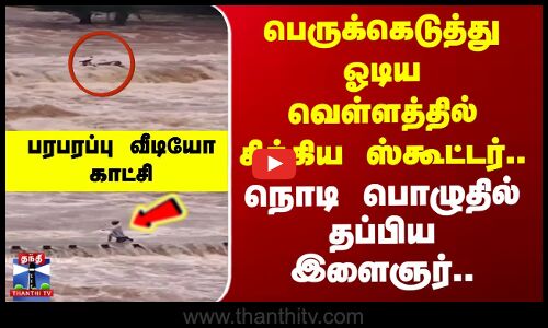 பெருக்கெடுத்து ஓடிய வெள்ளத்தில் சிக்கிய ஸ்கூட்டர்.. நொடி பொழுதில் தப்பிய இளைஞர்..