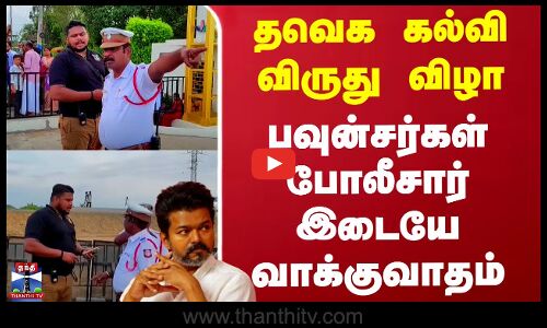 பொதுத்தேர்வில் சாதித்த மாணவர்களுக்கு த.வெ.க. தலைவர் விஜய் கல்வி விருதுகளை வழங்கி இன்று கவுரவிக்க உள்ளார். மாமல்லபுரத்தில் இந்த நிகழ்ச்சி நடைபெறும் நிலையில், பவுன்சர்கள் மற்றும் காவலர்கள் இடையே வாக்குவாதம் ஏற்பட்டுள்ளது...