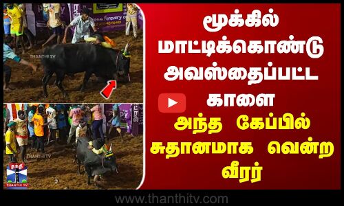 மூக்கில் மாட்டிக்கொண்டு அவஸ்தைப்பட்ட காளை - அந்த கேப்பில் வென்ற வீரர்