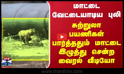 நீலகிரி மாவட்டம் கூடலூரில் பசு மாட்டை வேட்டையாடி உண்பதற்காக காத்திருந்த புலி, சுற்றுலா பயணிகளை பார்த்ததும் மாட்டை இழுத்துச் சென்று மறைத்து வைத்த காட்சிகள் வைரலாகி வருகின்றன. மசினகுடி மாயார் பகுதியில் உள்ள ராட்சத குழாய் மீது புலி ஒன்று படுத்திருந்தது. அதன் கீழ் பகுதியில் மாடு ஒன்று இறந்து கிடந்தது. இதனை சுற்றுலா பயணிகள் வாகனத்தை நிறுத்தி வீடியோ எடுத்தபோது புலி கீழே இறங்கி வேட்டையாடி வைத்திருந்த மாட்டை அங்கிருந்து இழுத்துச் சென்று பத்திரமாக மறைத்து வைத்தது . அந்த காட்சிகள் தற்போது இனையத்தில் அதிகம் பரவி வருகிறது.