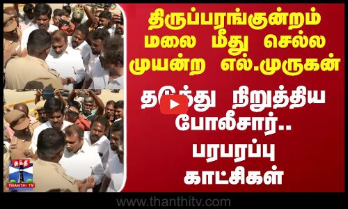 திருப்பரங்குன்றம் முருகன் கோயிலில் சாமி தரிசனம் செய்த மத்திய இணை அமைச்சர் எல்.முருகன், மலை மீது உள்ள காசி விஸ்வநாதர் கோயிலுக்கு செல்ல முயன்றபோது போலீசார் தடுத்து நிறுத்தியதால் பரபரப்பு ஏற்பட்டது...