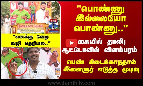 சென்னை தாம்பரத்தில், கடலூரை சேர்ந்த பிரபு என்பவர், ஆட்டோவில் விளம்பரம் செய்து பெண் தேடும் வீடியோ வைரலாகி வருகிறது. பெற்றோர் பெண் தேடியும் கிடைக்காததால், அவர் இந்த நூதன முறையை கையாண்டுள்ளார். விளம்பரம் செய்தது மட்டுமின்றி கையில் தாலியுடனே பல ஊர்களுக்கு சென்று வருகிறார்.
