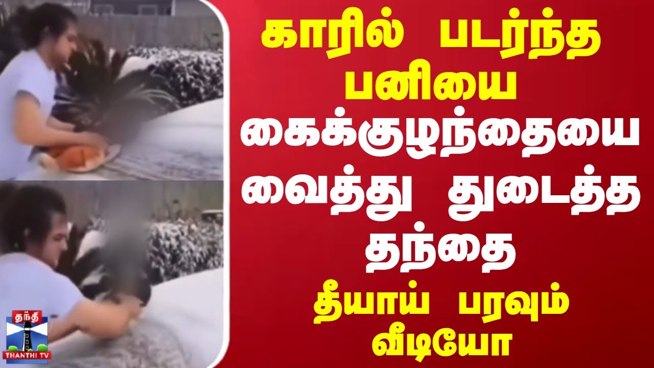 காரில் படர்ந்த பனியை கைக்குழந்தையை வைத்து துடைத்த தந்தை - தீயாய் பரவும் வீடியோ