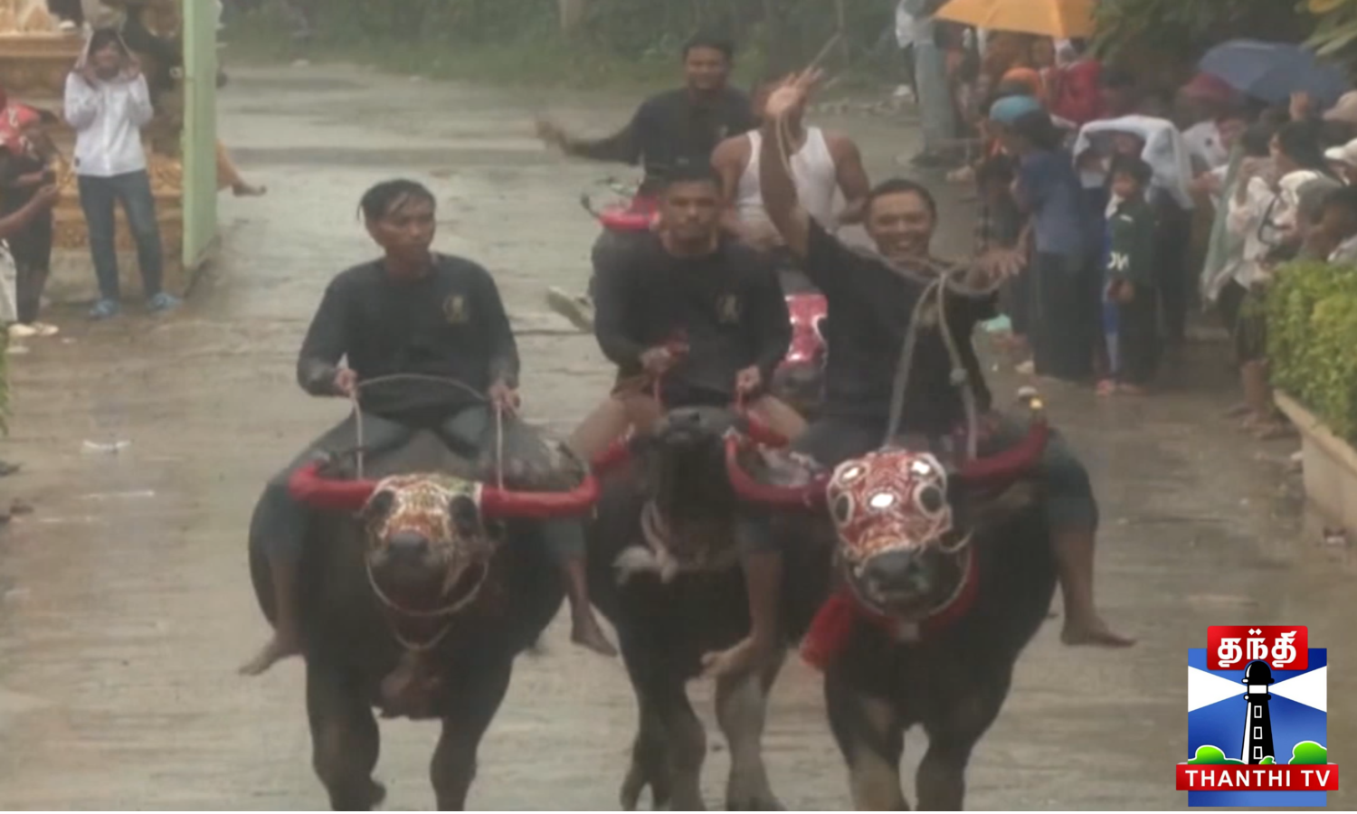 கம்போடியாவில், பாரம்பரிய நிகழ்வுகளில் ஒன்றான எருமைப் பந்தயம் கோலாகலமாக நடைபெற்றது. கண்டல் KANDAL மாகாணத்தில், மூதாதையர்களின் நினைவாக நடைபெறும் வருடாந்திர விழாவின் ஒரு பகுதியாக எருமைப் பந்தயம் நடைபெற்றது. இதில், விவசாயிகள் மற்றும் கிராம மக்கள் தங்கள் எருமைகளை பங்கேற்கச் செய்தனர். இதற்காக எருமைகள் அலங்கரிக்கப்பட்டு, அதன்மீது போட்டியாளர்கள் அமர்ந்து சென்றனர். இந்த நிகழ்வைத் தொடர்ந்து, மூதாதையர்களின் நினைவாக படையலிட்டு மக்கள் வழிபட்டனர்.