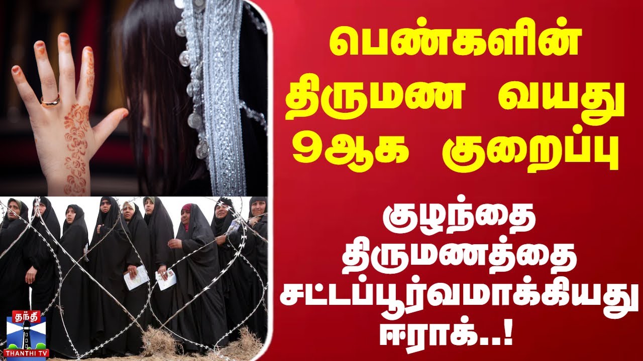 ஈராக்கில் பெண்களின் திருமண வயது 9ஆக குறைக்கப்பட்டுள்ளது. ஈராக் நாட்டில் ஷியா பிரிவு பெண்களின் திருமண வயதை 9ஆகவும், சன்னி பிரிவில் பெண்களின் திருமண வயதை 15ஆகவும் குறைத்து சட்டமியற்றப்பட்டுள்ளது. அத்துடன் திருமணம், விவாகரத்து போன்ற குடும்ப விவகாரங்கள் குறித்து முடிவெடுக்க நீதிமன்றங்களுக்கு அதிக அதிகாரம் வழங்கும் வகையில் திருத்தங்கள் மேற்கொள்ளப்பட்டுள்ளன.