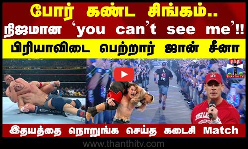 WWE-ல் ஓய்வு - ஜான் சீனாவுக்கு பிரியாவிடை அளித்த ரசிகர்கள் WWE ஜாம்பவான் ஜான்சீனா தனது கடைசி போட்டியில் தோல்வி அடைந்து, போட்டிகளில் இருந்து விடைபெற்றார்.