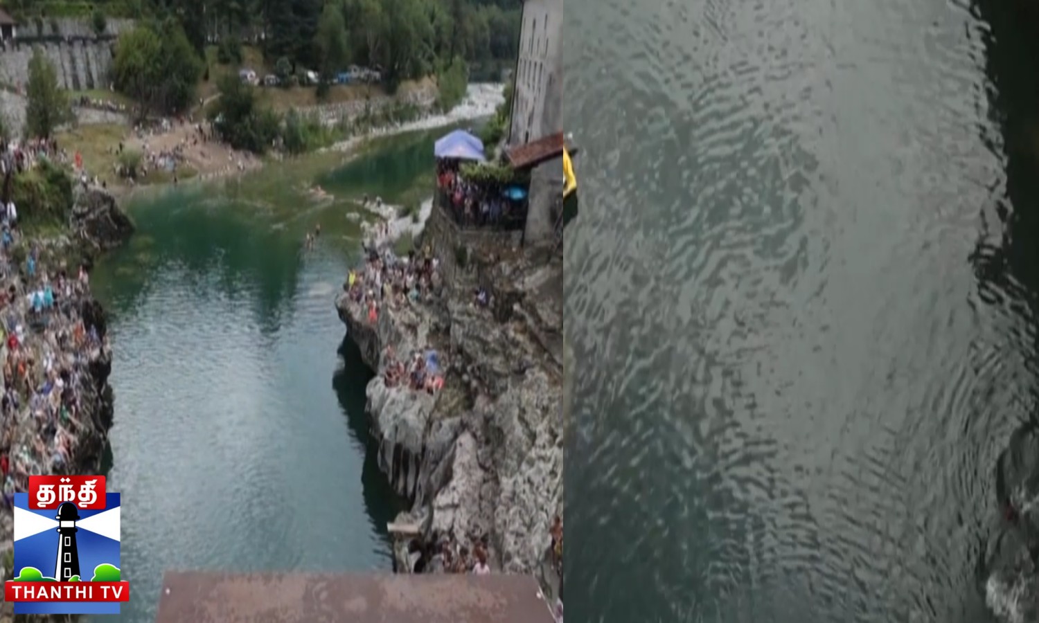 ஸ்லோவேனியாவில் 17 மீட்டர் உயரமுள்ள பாலத்தில் இருந்து துணிச்சலாக குதித்து டைவ் அடித்து வீரர்கள் சாகசத்தில் ஈடுபட்டனர். சோகா நதியின் மீது அமைந்துள்ள இந்தப் பாலத்தில் நடைபெற்ற போட்டியில் 14 நாடுகளைச் சேர்ந்த வீரர்கள் பங்கேற்ற நிலையில், அருகே உள்ள பாறைகளில் சுற்றி அமர்ந்திருந்த பார்வையாளர்கள் மலர்களை தூவி அவர்களை உற்சாகமூட்டினர்.
